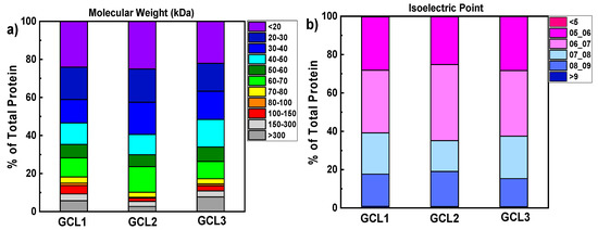 The fate of a nanovector depends largely on the type and amount of proteins that adhere to its surface when it comes into contact with a biological fluid; that is, when it enters the bloodstream. In fact, what cells really see is the new entity formed by the lipoplex surrounded by the adsorbed PC, and it is this PC the cells interact with rather than the lipoplex itself. Accordingly, the evaluation of the protein corona (in terms of its nature and composition) is crucial to understand the in vitro behavior of these non-viral vectors and even to estimate their potential success in vivo. The adsorption of proteins (PC formation) has special interest since one of the main barriers for nanovectors to reach the target cells is the opsonization process. Certain proteins can inhibit this process and increase the bloodstream time circulation, while those in charge of cellular recognition can even favor the passage through the cellular membrane. For that reason, in this work, lipoplexes formed by either GCL1, GCL2 or GCL3, combined with DOPE and pCMV-Luc at ρeff = 5 were incubated in HS and analyzed by nanoLC-MS/MS to determine the proteomic profile of their PC. A large number of proteins were found in all cases: 161 for GCL1/DOPE-pCMV-Luc, 143 for GCL2/DOPE-pCMV-Luc and 144 for GCL3/DOPE-pCMV-Luc, of which 127 were common to all of them. The presence of such a significant number of proteins in the PC has also been reported for PEGylated liposomes [58]. The relative percentages of the different proteins were calculated and subsequently classified according to their molecular weight (MW), isoelectric point (pI) and physiological function, as reported in Figure 4a–c, respectively (see also Table S2). The results show only 3–8% of proteins with a MW higher than 300 kDa, being proteins with MW < 70 kDa those predominantly adsorbed on the nanocarrier surface (82–90%), in agreement with those observed in a previously reported C3(C16His)2/MOG-siRNA nanovector with histidine-based polar heads [59]. Moreover, around 61–65% of adsorbed proteins present pI < 7, i.e., they bear a net negative charge at physiological pH, indicating that, as found in previous studies [52,59], strong electrostatic interaction between these proteins and the positively charged nanovectors is probably one of the main non-covalent intermolecular forces driving the PC formation process. In what respect to physiological function, lipoproteins were preferentially adsorbed on the surface of the three lipoplexes (37–39%), followed by acute-phase proteins (15–20%) and immunoglobulins (Igs) (12–17%). Igs and acute-phase proteins are considered responsible for the immune system response, recognizing pathogens and binding them to trigger the appropriate immune process. In contrast, a lipoprotein coverage is usually associated with improved bloodstream circulation times. Lipoproteins are related to intercellular transport of insoluble lipids, particularly cellular processes involved in cholesterol metabolism. On the other hand, tissue leakage, coagulation and complement proteins were those found in minor proportion (4–9%, 4–6% and 4–7%, respectively). Complement and coagulation proteins also participate in the innate immune response. By binding pathogens directly or indirectly (through antibodies), complement proteins induce an inflammatory response and the recognition by phagocytes, thus favoring the elimination of nanocarriers from systemic circulation. Although they are mainly in charge of maintaining hemostasis (i.e., blocking a bleeding process), coagulation proteins can also physically trap microbes or stimulate the opsonization process around pathogens. On the other hand, cellular death or damage provokes the release of tissue leakage proteins to the blood; therefore, they are found in lower concentration in blood than classical proteins such as Igs or coagulations proteins. The proteins identified for each physiological function are shown in detail in Figure S2 (major fraction) and Figure S3 (minor fraction). The slight differences found in the PC of the three lipoplexes are necessarily attributed to the diverse nature of the gemini cationic lipid (head and spacer group). These structural differences are expected to be rather subtle from the perspective of the adhering proteins. Moreover, the content in DOPE does not seem to drastically influence the PC composition, notwithstanding that zwitterionic species usually avoid protein adsorption [60].