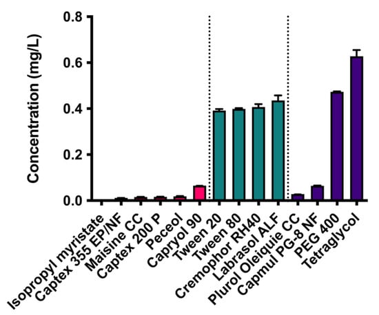 To assess the saturation concentration of CXB in different oily phases (Capryol 90, Captex 200 P, Captex 355 EP/NF, isopropyl myristate, Maisine CC, and Peceol), surfactants (Cremophor RH40, Labrasol, Tween 20, and Tween 80), and co-surfactants/co-solvents (Capmul PG-8 NF, PEG 400, Plurol oleique CC 497, and tetraglycol), an excess amount of CXB was added to the liquid excipients and placed in a tube rotator at 20 rpm and 30 °C for a day. After that, samples were centrifuged at 14,000 rpm for 20 min and the supernatant was appropriately diluted in methanol. The drug concentration was determined at 252 nm with a UV-VIS spectrophotometer Unicam UV 500A (Gemini, Apeldoorn, The Netherlands). The concentration was measured again every two to three days until it did not change anymore, thus assuming that the saturation concentration was reached.