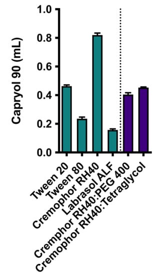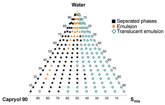 mix:oil mixtures in 500 µL Eppendorf tubes to a final volume percentage varying from 5% to 95% and an end volume of 500 µL. Directly after the addition of water, the samples were vortexed for 30 s and stored at room temperature for 24 h. After 24 h, the solutions were visually examined against a black background for transparency and phase separation. Separated phases indicated the formation of an unstable emulsion, turbidity or a white appearance indicated the formation of a stable emulsion, and transparency or light bluish appearance indicated the formation of a micro-emulsion/nano-emulsion. The classification according to the appearance was based on Cui et al. [