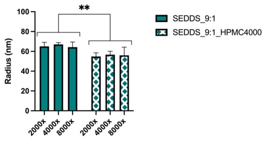 The droplet size of the final formulations was measured with dynamic light scattering (Mobius, Wyatt Technology, Santa Barbara, CA, USA) at different dilutions: 2000×, 4000×, and 8000× in GISS phase III in triplicate. GISS phase III was filtered through a 0.02 µm filter before the SEDDS was immersed into it. An acquisition time of 5 s and an acquisition number of 10 were used. The samples were measured within 10 min upon dilution. The droplet size was obtained by regularization analysis in the DYNAMCIS Software (Wyatt Technology Corporation, Santa Barbara, CA, USA) since it is appropriate for both monomodal and multimodal samples. Results were statistically analyzed by using a two-way ANOVA test, p values < 0.05 were considered significant.