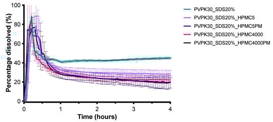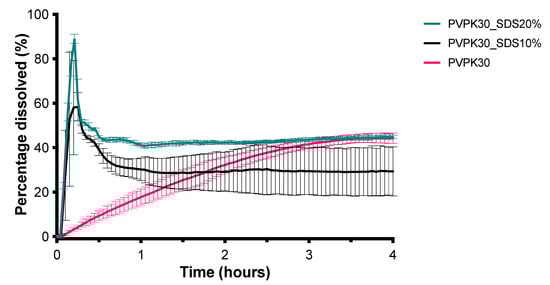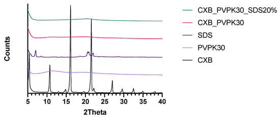 23]. Partially similar results were obtained in this study since incorporation of SDS resulted in a spring dissolution profile of CXB for the PVPK30_SDS20% formulation (