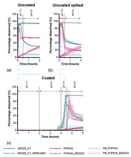 Figure 12c) may affect the dissolution behavior of the CXB formulations. The PVPK30_SDS20% formulation was negatively impacted by the presence of the coating, indicated by a larger CXB precipitation after the initial dissolution peak. This might be explained by the talc particles present in the dissolution medium which can act as nuclei, facilitating crystallization of CXB. Not only did the components in the ColoPulse coating have an impact on the release profile of CXB, but also on the physical inclusion of the formulation by the coating. The presence of the ColoPulse coating on the capsules had the greatest impact on the PVPK30 SD formulation. Its release profile resembled that of PM_PVPK30, indicating rapid crystallization of CXB. Even though SDS in the PVPK30_SDS20% formulation was unable to prevent crystallization, due to the presence of the nuclei in the coating, it was able to prevent the detrimental effect of inclusion. The inclusion affected the dissolution of the SEDDS_9:1 formulation as well, as indicated by a slightly lower peak concentration of CXB. In contrast, the dissolution behavior of the SEDDS_9:1_HPMC4000 formulation was unaffected. The results showed that the SEDDS formulations are best equipped to overcome the negative effect of the application of a coating, since the formulations can flow freely and quickly out of the capsules. Further nucleation crystals in the ColoPulse coating were unable to induce crystallization, probably due to the rapid formation of the emulsion.