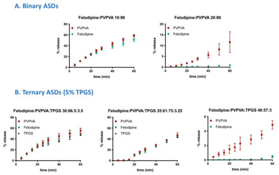 Surfactants are well known to enhance drug solubility through micellar solubilization [,], and thus, this is an obvious factor to consider. For conditions used in this study, TPGS CMC ranges between 40 and 50 µg/mL, whereby the final TPGS concentration in the bulk medium (assuming 100% release) is both below and above CMC depending on drug loading and surfactant level (Table S2). We observed no correlation between the presence or absence of micellar TPGS and the resultant release behavior. For example, the LoC for felodipine-PVPVA ASDs increases from 15% DL without TPGS to 25% DL with 2% TPGS, although final TPGS concentrations remain below the CMC (Figure 5, Table S2). Similarly, for 30% DL, TPGS level is below CMC for a 5% TPGS ASD and above CMC for the 10% TPGS ASD (Table S2); however, both ASDs show a congruent release of components (Figure 3 and Figure S3). Thus, solution solubilization by TPGS micelles plays a negligible role in impacting the LoC. This was further corroborated with a control experiment where TPGS was pre-dissolved in the dissolution medium at an equivalent level to the 30% DL ternary ASD with 5% TPGS. While the 30% DL ternary ASD showed congruent release (Figure 2 and Figure 3), the corresponding 30% DL binary ASD still showed incongruent release of drug and polymer (Figure 7), despite the presence of the pre-dissolved surfactant. These observations indicate that surfactants impact release beyond any benefit incurred from wetting improvement, and they point to the importance of incorporating the surfactant as an ASD component rather than as an external excipient in the formulation. Furthermore, these results suggest that the improvement in LoC in the presence of the surfactant is a phenomenon associated with the hydrated matrix or the interface between the ASD matrix and the bulk solution.