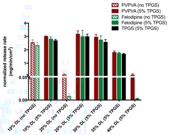 Surface-normalized dissolution rates for amorphous felodipine, PVPVA, and TPGS (where applicable) for different drug loading ASDs without TPGS [] and with 5% TPGS. Error bars represent standard deviations, n = 3. TPGS levels were below the quantification limit for 40% DL ternary ASDs.