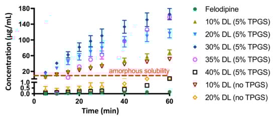 Concentration versus time profile for felodipine from amorphous drug alone, and as part of a PVPVA-based ASD with and without 5% TPGS. The legends represent drug loadings (by weight) and TPGS% in the ASDs. Error bars represent standard deviations, n = 3, and may be smaller than symbols in some instances.