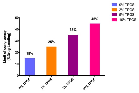 Limit of congruency (% drug loading by weight) for felodipine:PVPVA ASDs at different levels (0% [], 2%, 5%, and 10% TPGS).