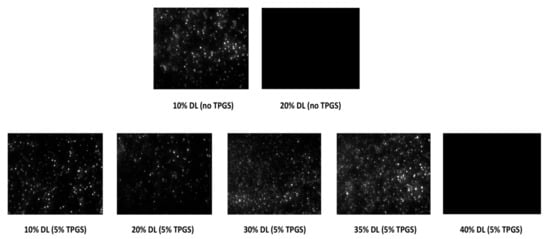 Figure 8 shows the representative NTA images acquired on solutions removed after 60 min of surface normalized release experiments. NTA provides visual evidence of amorphous nanoparticles by detecting the light scattered as they move under Brownian motion. It was observed that ASDs with drug loadings up to the LoC, i.e., 10–35% DL with 5% TPGS, and 10% DL without TPGS, led to the formation of amorphous nanoparticles upon dissolution.
