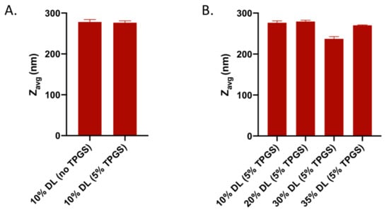 Z-average (Zavg) particle diameter for amorphous nanoparticles generated upon dissolution: without and with TPGS (5%) at 10% DL (A) and at different DLs with 5% TPGS level (B).