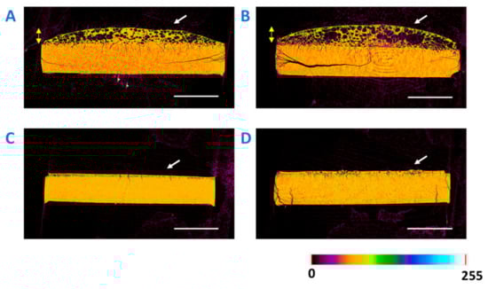 X-ray microcomputed tomography cross-sectional images for the 30% DL ASD tablets with 0% TPGS (A), 2% TPGS (B), 5% TPGS (C), and 10% TPGS (D) after 10 min of dissolution. Scale bar (in white) is 2 mm. Arrow (in white) on the images is pointing toward the dissolution front of the tablet. The color bar represents the range of density measurement from lowest (0) to highest (255).