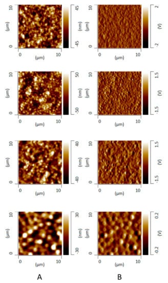 AFM topographical (A) and deflection images (B) obtained after incubation of 30% DL felodipine-PVPVA ASD films in a water-saturated chamber for 12 h. The films contained various levels of TPGS: 0%, 2%, 5%, and 10% (from top to bottom).