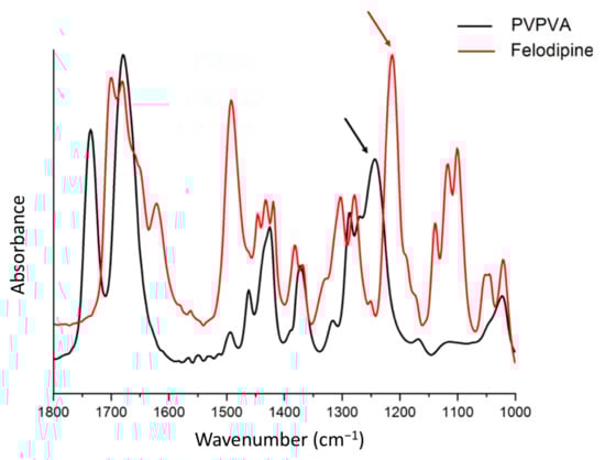 Bulk IR spectra of amorphous felodipine and PVPVA. The amorphous felodipine peak at 1213 cm−1 (indicated by red arrow) and PVPVA peak at 1243 cm−1 (indicated by black arrow) were used to differentiate drug-rich and polymer-rich phases in phase-separated ASD films.