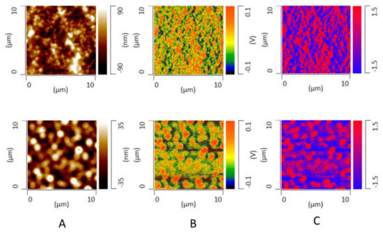 AFM nanoIR images of 30% DL felodipine-PVPVA ASD films, without TPGS (top panel) and with 10% TPGS (bottom panel), after storing in a water-saturated chamber for 12 h: (A) topographical image, (B) IR image at 1213 cm−1, and (C) IR ratio image (1213 cm−1/1243 cm−1), where red areas are drug-rich.