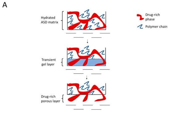 Schematic showing microstructure evolution and dissolution process of drug and polymer from high drug-loaded ASDs at lower and higher surfactant levels: (A) Phase behavior and dissolution process of 30% DL felodipine-PVPVA ASDs without TPGS and 2% TPGS, whereby phase separated drug-rich and polymer-rich phases release incongruently, leaving behind a porous drug-rich layer on the tablet surface and (B) Phase behavior and dissolution process of 30% DL felodipine-PVPVA ASDs with 5% and 10% TPGS, whereby drug-rich domains release intact as the polymer dissolves and the transient gel layer recedes, leading to the congruent release of drug and polymer (Adapted with permission from [], Elsevier, 2002).