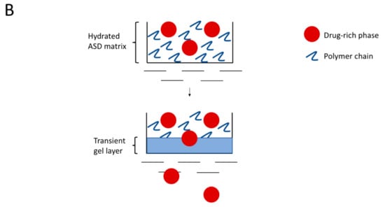 An increasing number of drug candidates emerging from drug discovery pipelines are poorly water soluble [,]. Amorphous drugs offer increased transient solubility compared to their crystalline counterparts; however, this solubility advantage is often not sufficient to deliver high dose drugs [,]. Therefore, the dissolution advantage derived from polymer-controlled dissolution of amorphous solid dispersions (ASDs), where drug is molecularly dispersed in a hydrophilic polymer matrix, is gaining increased attention from drug product formulators and researchers [,]. The dissolution rate of a hydrophilic polymer is many times higher compared to that of a lipophilic drug. Consequently, drug release from an ASD, when polymer-controlled, is typically relatively rapid and results in a highly supersaturated solution with a drug concentration that exceeds the amorphous solubility [,]. The drug in excess of amorphous solubility phase separates to form in situ amorphous drug-rich nanoparticles that are dispersed in the bulk aqueous phase, which is a phenomenon referred to as liquid–liquid phase separation []. These nanoparticles, owing to their small size (<1 µm), provide additional dissolution benefits and, in turn, a bioavailability advantage [,,]. However, the exact mechanism of the formation of these nanoparticles as well as their role in bioavailability enhancement is still under debate [,,,,].