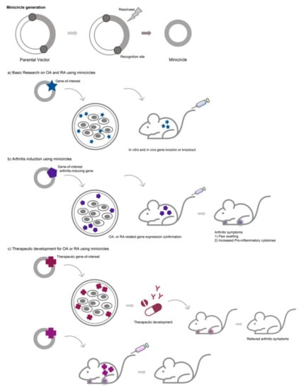 Minicircles have been applied in several studies related to arthritic diseases using different approaches. The purpose of the studies can be divided into three general groups: (1) basic research on arthritis, (2) arthritis induction, and (3) gene therapy and cartilage regeneration (Figure 1).