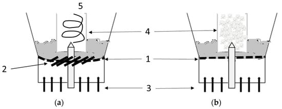 Scheme of chambers with SW (a) and CW (b) distributor: 1—curved (a) and flat (b) air distributors, 2—swirl generator, 3—air inlet, 4—draft tube, 5—particles’ movement.