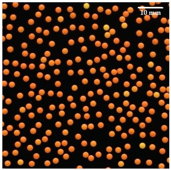At least 1000 MT were imaged using an Epson Perfection V700Photo scanner (Epson, Nagano, Japan). Scanning was performed with 48-bit color depth and a resolution of 600 dpi. All color and image corrections were disabled in the scanner software. MT were oriented horizontally on the central part of the scanner surface (72 × 296.8 mm2) with the scanner lid open, to obtain an image of MT with a black background (Figure 2). The color analysis was performed using an in-house OpenCV C++ program, which performed image segmentation (detection of individual MT) and color analysis. The color analysis was done in the Hue, Saturation and Value (HSV) color space. The average hue value of the central 3 × 3 pixels (127 × 127 µm2) of each mini-tablet was recorded and used in further analysis. The hue for red-yellow colors is defined as 60 * (G − B)/(R − B), where G is green, B is blue and R is the red color channel. The recorded hue value correlates with the mini-tablet local coating thickness [40]. For analysis of the results’ variation, the interquartile range (IQR) divided by the median was calculated, which can be expressed using percentiles: (H75 − H25)/H50.
