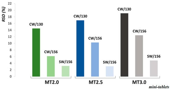 Additionally, the hardness of coated MT for samples (n = 100) from each batch was evaluated (Table 3). Only 20 µm of film thickness almost doubled MT average hardness (see also Table 1). A similar pattern as in the case of UV-Vis data for the film thickness RSD can be also deducted from the MT hardness measurements. The underlying cause for such similarity is the assumption that an individual mini-tablet with a higher coating thickness will on average exhibit a higher crushing strength. The highest hardness variability (RSD) was observed in the case of MT coated in the CW distributor at 130 m3/h airflow rate. Increasing the airflow rate to 156 m3/h resulted in more uniform hardness (RSD not more than 11%), but only a change in the distributor to SW lowered tablet hardness RSD to no more than 9%.