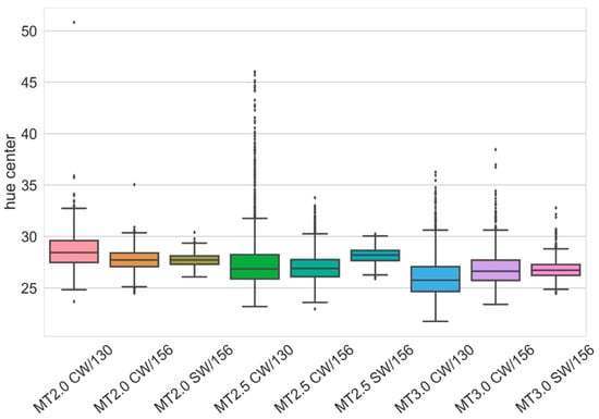 Box plot of coating hue value at the center of the mini-tablet cap face.