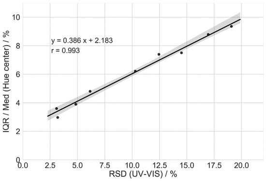 The coating variability results obtained using UV-VIS and color analysis are summarized in Table 4. Due to a large number of outliers observed in certain analyzed cases (Figure 5), in addition to the center hue RSD, another parameter was employed to measure the coating variability. An interquartile range (IQR), normalized by the median of hue, showed a good correlation (R = 0.993) with the RSD results obtained using UV-VIS (Figure 6). However, it is important to note that the imaging color analysis has several advantages compared to the UV-VIS. The method is non-destructive, fast, and can be easily used during the analysis of a large number of samples, yielding higher statistical confidence. Based on chi-square statistics, the confidence interval is 8.780–11.617 when the standard deviation equals 10 and the number of samples is 100, and when 1000 units are measured, the confidence interval is 9.580–10.459.