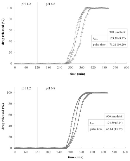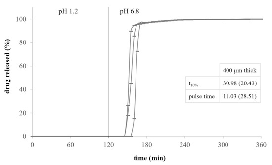 As expected, upon immersion in aqueous fluids, the formation of a gel layer around the HPC-based shells was observed. The gel underwent slow dissolution/erosion phenomena, which hindered the penetration of the solvent into the cavity and deferred the liberation of the drug tracer. Lag time (i.e., t10%) and duration of release (i.e., pulse time) turned out to be dependent on the shell thickness. Indeed, increasing it from 600 to 900 µm, the lag time was extended of approximately 50 min. The pulse time was in both cases less than 10 min, pointing out that, once the first opening of the shell occurred, the thickness of the polymeric barrier to be dissolved/eroded would not mainly affect the time needed to complete the liberation of the conveyed formulation.