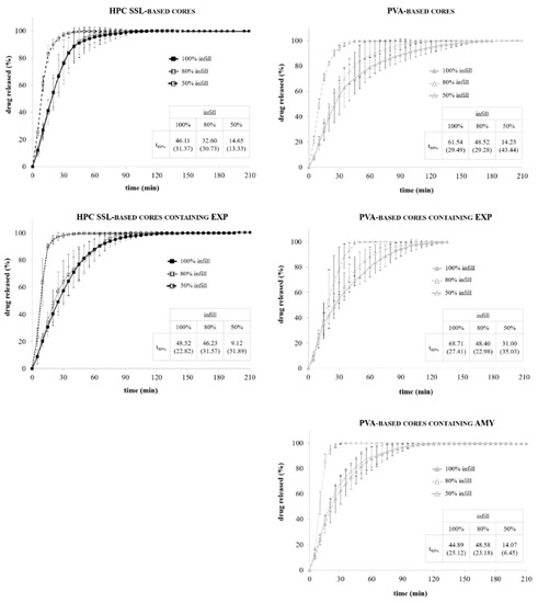 When EXP was added, a tendency of the core to disintegrate, thus improving drug liberation rate, was only noticed in the case of samples composed of the polymer characterized by a lower viscosity (HPC SSL) and having the less coherent structure associated with the 50% infill. In the case of PVA-based cores, which showed the slower dissolution rate, the presence of AMY had a positive impact on the liberation rate, especially when dealing with samples printed with 50% infill. This was in agreement with preliminary literature findings regarding food packaging applications [64,65,66,67].