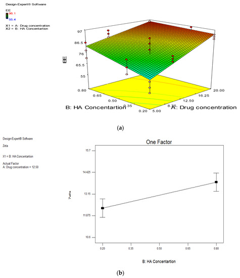 None of the tested variables had a significant effect on the PS or The PDI of the prepared hyaluosomes (p > 0.05). Concerning the ZP, all the prepared hyaluosomes were negatively charged, owing to the presence of Soya lecithin [36] and HA which carry negative surface charge [21]. ANOVA results revealed that only the HA concentration has significant positive impact (p = 0.0128). Figure 1b showed that increasing HA concentration results in the formation of vesicles with significantly higher ZP. This is attributed to the negative charge of the HA molecule [37,38].
