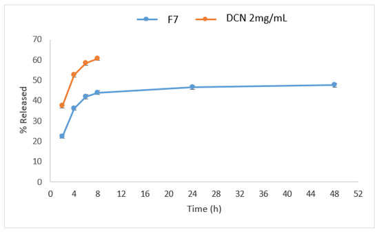The percentages DCN released from optimized DCN-loaded hyaluosomes and DCN dispersion in distilled water at different times intervals were measured, and the release profiles are graphically illustrated in Figure 2. Results showed that the optimized formulation (F7) succeeded to sustain the release of DCN compared to that from DCN aqueous dispersion. The optimized DCN-loaded hyaluosomes (F7) released less than 50% DCN over 48 h, whereas more than 50% were released in the first 4 h from the aqueous DCN dispersion. Nanovesicles containing soya lecithin forming the lipid bilayer can help in retarding diffusion of dissolution media inside the hyaluosomes, resulting in sustained DCN release [39]. In addition, HA has a bulky structure with long chains of sugar groups is supposed to remain in the core of the phospholipid bilayer vesicles, although these repeated long chains of sugar units can stick out of the vesicles leading to steric stabilization which in turn resulted in sustaining the release of DCN from the hyaluosomes [22]. Similar results were obtained by Shao et al. [40] in their study on a HA modified, doxorubicin co-delivered hybrid nano system for leukemia therapy, where they found that HA coating on the nano system delayed the drug release.
