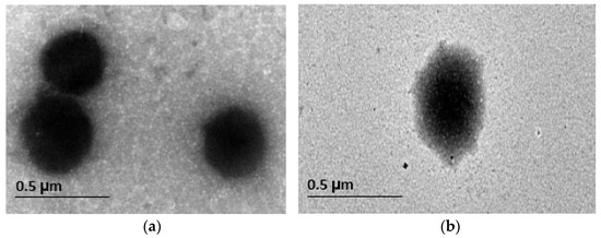 TEM micrographs of the optimized DCN-loaded hyaluosomes and DCN-loaded liposomes (without HA) revealed vesicles that are spherical in shape, yet non-aggregating, having smooth surface and sharp boundaries as illustrated in Figure 3a,b. Moreover, the observed diameter by TEM micrographs was in accordance with the size obtained by the Zetasizer. Figure 3b showed the gel core hyaluosomes in which HA appears in the hydrophilic core of the prepared hyaluosomes. Similar results were obtained by described by El-Refaie et al. [21] in their study on Gel-core Hyaluosomes for transdermal drug delivery of HA.