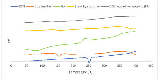 DSC is a common tool to analyze the physical properties of the material and to give information onto the melting and recrystallization manner of crystalline materials [44]. Figure 5 shows the DSC thermograms for DCN, soy lecithin, HA, and the optimized lyophilized DCN-loaded and the corresponding blank hyaluosomes. The DSC thermogram of DCN showed a sharp endothermic peak at about 255 °C corresponding to its melting point [45]. The DSC thermogram of Soya Lecithin showed an endothermic peak around 155 °C due to its melting point [46]. The DSC thermogram of the HA showed an exothermic peak at around 240 °C that can be attributed to the degradation of the polysaccharide [47]. No new peaks were observed in the thermogram of the blank hyaluosomes, indicating the absence of any unwanted interactions. Only the intensity of peaks has been decreased due to the dilution occurring during formulation. Total disappearance of DCN peak was noticed in the thermogram of the DCN-loaded hyaluosomes (F7) confirming that DCN was molecularly dispersed or present in the amorphous state within the hyaluosomes. Similar results were obtained in several studies in the literature [48,49,50].