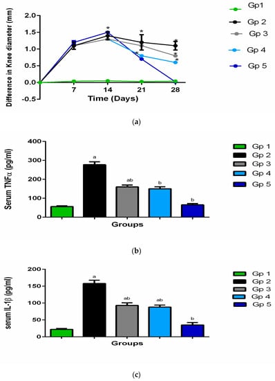 As a main pharmacodynamic evaluation of the arthritis progression and administered treatment efficacy, the rats’ knee swelling was assessed by determining its diameter. The swelling of the knee was defined as the change between the recorded value at normal condition before arthritis induction and the value measured after arthritis induction, at different times. The results are presented in Figure 6a.