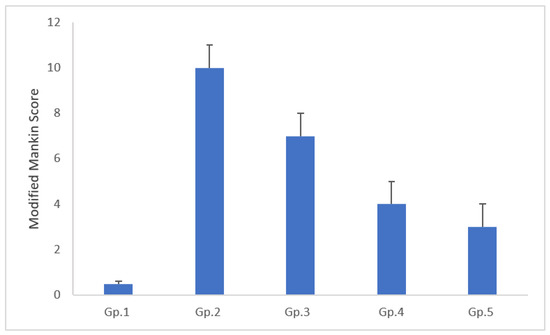The inflammation degree of tibiofemoral articular cartilage was evaluated using modified Mankin score, Figure 7, together with, microscopic histopathological investigation using both H&E stains Figure 8a–e. Referred to modified Mankin grading, a score was given to inflammation starting from 0 to 13, where, 0 refers to normal cartilage, while 13 is the maximal score, for osteoarthritic model. Different study groups revealed significant difference (p < 0.05).