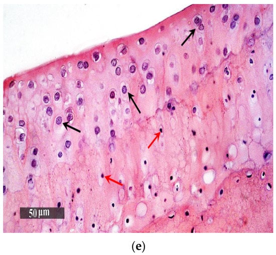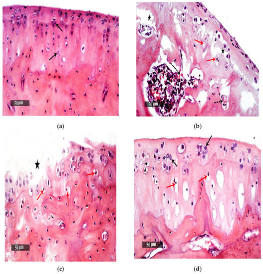 Gp.2 (positive control of rats receiving no treatment) samples showed wide areas of cartilaginous surface erosions and fissures (star) with significant loss of chondrocytes and many degenerated and necrotic changes records (red arrow) accompanied with congested subchondral blood vessels (dashed arrow). Abundant inflammatory cells infiltrate records in synovial membranes (red arrow—Figure 8b) with mild focal hyperplasia of covering epithelium. (Mean Mankin score = 10).