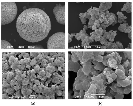SEM images of PS300 and CaSiO3 are shown in Figure 1. In the image of the PS300, the particles exhibit a spherical shape and a unique petal-like structure with a markedly porous nature (Figure 1a). The surface of the CaSiO3 is smooth, and no porous nature is observed (Figure 1b).
