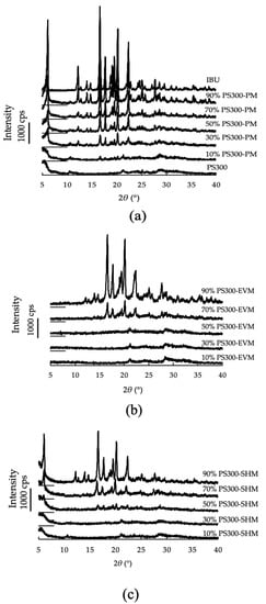 PXRD patterns of various samples. (a) IBU, PS300, and PMs of various mixing ratios; (b) EVMs of various mixing ratios; (c) SHMs of various mixing ratios.