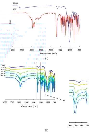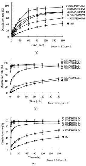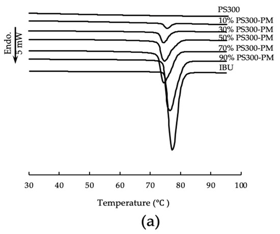 The DSC curves of the PS300, IBU crystals, and various PMs are shown in Figure 3a. Neither endo- nor exothermic peak due to PS300 was observed in the DSC curves; however, endothermic peaks due to the melting of IBU crystals were observed at 74–83 °C on the DSC curves of all PMs.