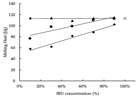 The enthalpy of fusion of IBU in various samples. ×: IBU crystals; ◆: PS300-PMs; ●: CaSiO3-PMs; ▲: ZrO2 Beads-PMs.