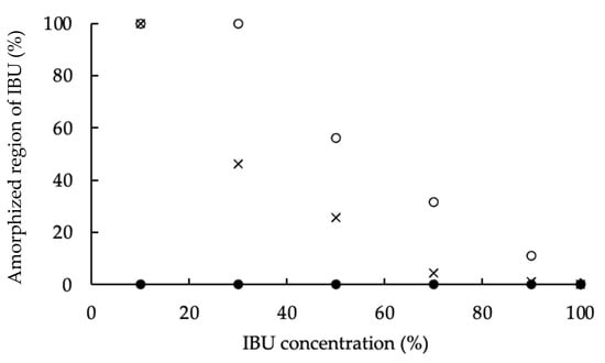 Percentage of the amorphized region of IBU in various samples. ○: PS300-PMs; ×: CaSiO3-PMs; ●: ZrO2 Beads-PMs.