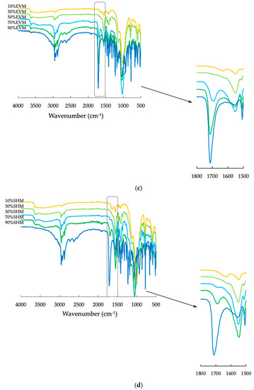 We evaluated the molecular interactions between the surface of the PS300 and IBU molecules using ATR-FTIR. On the IR spectrum of the IBU, a prominent peak of the C=O stretching vibration band at 1710 cm−1 was observed, as shown in Figure 6a. In addition, in the IR spectrum of PS300, the peak was due to the -OH bending vibration band at 1635 cm−1, as shown in Figure 6a. All samples had a peak in the PMs due to the C=O stretching vibration band at 1710 cm−1; they also had a peak at 1550 cm−1, as shown in Figure 6b. In EVMs and SHMs, the peak at 1710 cm−1 disappeared when the content of IBU was 10% and 30% in the mixtures, and the peak intensity of 1550 cm−1 was stronger than at other contents of IBU, as seen in Figure 6c,d. As reported in our previous study, adsorbed IBU forms calcium salt due to the interaction between the IBU and calcium on the surface of the PS300 [37]. In this study, it was confirmed that calcium salt was formed on the surface during the adsorption of IBU onto PS300 (data not shown).