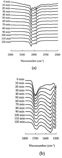 FTIR spectra of 50% PS300-PM, at different time points (0–120 min), at 70 °C. (a) From 3300–2500 cm−1; (b) from 1800–1500 cm−1.