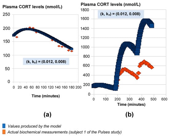 Mathematical model predictions of plasma cortisol levels assuming constant absorption (kα) and secretion (k) rates. The model fits the data during the first three hours (a), but for the estimated (k, kα) values, it significantly deviates from the observed plasma cortisol values past the first three hours (b). Plasma cortisol measurements belong to Subject 1 from the Pulses study (see Materials and Methods). CORT: cortisol.