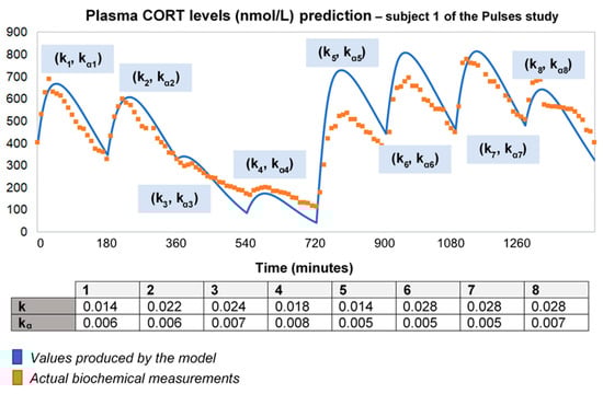 Figure A1 represents a comparison of the revised model predictions with plasma CORT data, if calculation of the initial pair of (k, kα) is based on different sets of four CORT time point measurements. The time distance between the four CORT measurements was retained across the different calculations (t0, t0 + 30 min, t0 + 60 min, and t0 + 90 min), but each initial time t0 was shifted by 3 h (black arrows and light blue frames). The data from the Pulses study Subject 1 was used (see Materials and Methods). CORT: cortisol, k: clearance rate, kα: absorption rate. Time points of delivery (magnitude of doses): 0 min (2.3 mg/230 μL), 180 min (2.3 mg/230 μL), 360 min (0.5 mg/50 μL), 540 min (0.5 mg/50 μL), 720 min (4 mg/400 μL), 900 min (4 mg/400 μL), 1080 min (4 mg/400 μL), 1260 min (2.3 mg/230 μL). The orange dots in the diagrams represent the actual plasma cortisol measurements (which are the same in all cases), and the continuous lines (of varying colours) represent the model predictions (which slightly change depending on the set of four CORT measurements, which the calculations were based on).