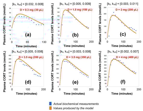 Simulation of plasma cortisol changes in different healthy subjects with pharmacologically suppressed cortisol biosynthesis with dexamethasone (see Materials and Methods) after the subcutaneous infusion of varying doses of hydrocortisone. The simulations were produced by the revised model (see Materials and Methods), which assumes discretely varying absorption and secretion rates of cortisol. (a) female subject, BMI: 20.4, pulse time: 10:00 a.m., pulse volume (D): 30 μL (0.3 mg); (b) male subject, BMI: 30, pulse time: 10:00 a.m., pulse volume (D): 150 μL (1.5 mg); (c) male subject, BMI: 22.5, pulse time: 10:30 a.m., pulse volume (D): 200 μL (2 mg); (d) male subject, BMI: 21.2, pulse time: 09:50 a.m., pulse volume (D): 350 μL (3.5 mg), (e) male subject, BMI: 23.3, pulse time: 10:10 a.m., pulse volume (D): 350 μL (3.5 mg); (f) female subject, BMI: 23.4, pulse time: 09:50 a.m., pulse volume (D): 400 μL (4 mg); BMI: body-mass index, CORT: cortisol, D: dose.