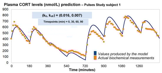 Under the assumption of discretely varying absorption and clearance rates, we proceeded to recalibrate the model by computing just a single pair of initial (k0, kα0) for each individual (rather than every 3 h). To do this, we first used six 3-h healthy volunteer profiles with endogenous cortisol secretion suppressed by dexamethasone (Figure 3). Subsequently, we replicated the 24-h plasma cortisol profile of Subject 1 from the Pulses study by just estimating a single, initial pair of (k0, kα0). Specifically, we estimated k0 = 0.016 and kα0 = 0.0074 from only 4 plasma cortisol measurements (t0, t0 + 30 min, t0 + 60 min and t0 + 90 min). We chose t0 as the first cortisol measurement (which was concurrent with the 15 h pulse from the pump) (Figure 4).