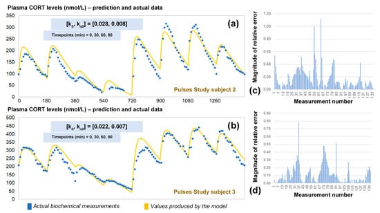The revised assumptions enabled the model to estimate plasma cortisol data through a simple and easy to use algorithm requiring only four data points as inputs. To validate our approach, we predicted the 24-h cortisol profile from the remaining two participants from the Pulses study (Figure 5). We did this by calculating the corresponding single pair of (k0, kα0) rates from only four plasma cortisol values measured at time points 0, 30 min, 60 min and 90 min. We also estimated the magnitude of the relative error for every time point of the model predictions versus the plasma cortisol data. Finally, the mean absolute error was estimated to be 14%.