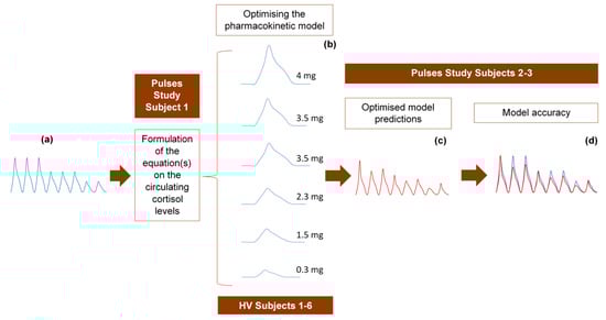 The 24-h hormone profiles of 9 participants (6 healthy volunteers and 3 adrenal insufficiency patients) were used to validate the model as follows: randomly, one of the 24-h profiles was initially used to formulate the equation describing the circulating plasma cortisol concentration as a function of time. The 6 profiles from the healthy volunteer study were subsequently used to refine the pharmacokinetic model through model parameter estimations, optimisations and validation of the assumptions related to the absorption and clearance of cortisol. Finally, we tested the accuracy of the model to replicate the data from the two remaining 24-h profiles of the Pulses study (Figure 6).