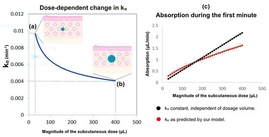 The reasoning behind the assumptions regarding the absorption rate of subcutaneous hydrocortisone (HC) administration. This rate depends on the subcutaneous dose magnitude, and the within-subject change in absorption rate with time. HC is a lipophilic molecule; its diffusion is hardly restricted by tissue membranes and thus can be assumed to be isotropic. Accordingly, we used a sphere as an approximation of the shape and movement of hormonal molecules infused into the subcutaneous tissue. Left: the higher the subcutaneous dose volume, the lower the absorption rate kα (kα is inversely proportional to the cubic root of the dose volume). When a small dose is administered by the pump cannula (e.g., 30 μL or 0.3 mg of HC) (a), the ratio of the area of the sphere to its volume is approximately 2.4-times greater than when a 13-times larger dose is administered (e.g., 400 μL or 4 mg of HC) (b). Therefore, the absorption rate drops to almost a similar degree (from about 0.01 to about 0.004). When administered in high doses, an increased fat deposition of the hormone could also contribute to dose-dependent changes in the absorption rate. Right: compared to the state where the absorption rate was considered constant and independent of the dosage, our assumption (of a dose-dependent kα) indicates that in lower doses, the absorption would be higher, while in higher doses would be lower (c). Part of the Figure has been created with BioRender.com.