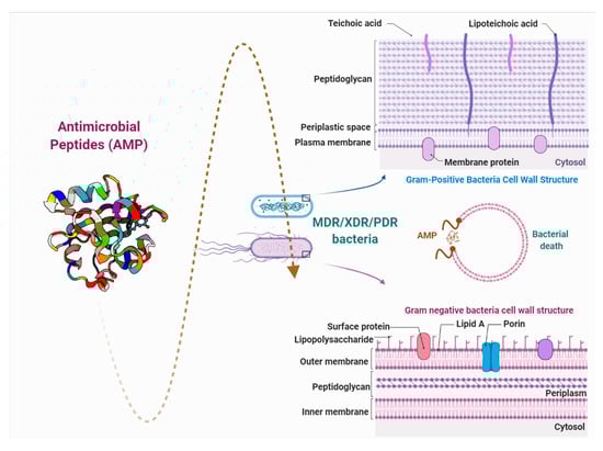 Brief description of the interaction between antimicrobial peptides and the bacterial cell wall. PDR: pandrug resistance, XDR: extensive drug resistance, and MDR: multidrug resistance.