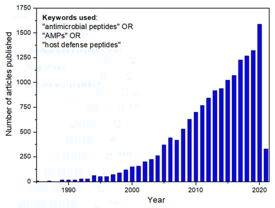 Innate immunity is the oldest defense system against invading microorganisms. It is the first-line mechanism to virtually protect all multicellular organisms from pathogens. Particularly, a set of biomolecules from the mammalian innate immune system is notably similar to components in other kingdoms, such as plants and insects. In this way, evidence indicates that these molecules—AMPs—could have emerged in common ancestors a long time ago, in the evolutionary processes. Defensins, a classical example of very active AMPs against fungi and bacteria, are found in plants and mammals and have essentially the same tridimensional structure in both organisms [7]. AMPs present a broad structural and functional diversity. Over the last decade, researchers have shed light on AMPs, notably receiving attention for the development of new and natural antibiotic candidates (Figure 2). AMPs are interesting for treating infections, mainly those caused by the so-called and dangerous multidrug-resistant (MDR) bacteria. Nowadays, infections caused by this group of bacteria have reached a pan-drug resistance level, which means resistance to all available conventional antibiotics. Curiously, this scenario was predicted by the penicillin discoverer, Alexander Fleming, who received a Nobel Prize in 1945 and anticipated that the global misuse of antibiotics in several areas could generate a frightening panorama [8].