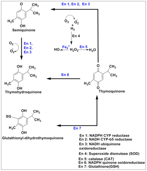 Orally administered TQ is biotransformed into hydroquinone by DT-diaphorase (a quinine reductase enzyme) [13]. Enzyme glutathione and NADPH (nicotinamide adenine dinucleotide phosphate oxidase) quinine oxidoreductase converted it into glutathionyl-dihydrothymoquinone and thymohydroquinone, respectively, via the redox mechanism [14]. TQ catalyzes in a two-step one-electron reduction or a two-electron one-step reduction. In one-electron two-step reduction of TQ, microsomal NADH cytochrome-b5 reductase, mitochondrial NADH ubiquinone oxidoreductase, and microsomal NADPH cytochrome P450 reductase convert TQ into semiquinone, which is further biotransformed into thymohydroquinone [15,16]. Conversely, a one-step two-electron reduction directs the conversion of TQ into thymohydroquinone [17]. Semiquinone of TQ is also known to possess oxidative stress-producing capabilities in cancerous tissues. Superoxide anion produced via oxidation can be nullified by TQ administration [18]. Due to the lack of detoxifying enzymes, which is quite common in cancer cells, the accumulated superoxide may exert the pro-oxidant effect of TQ [19]. The physiological catalysis of TQ is summarized in Figure 2.